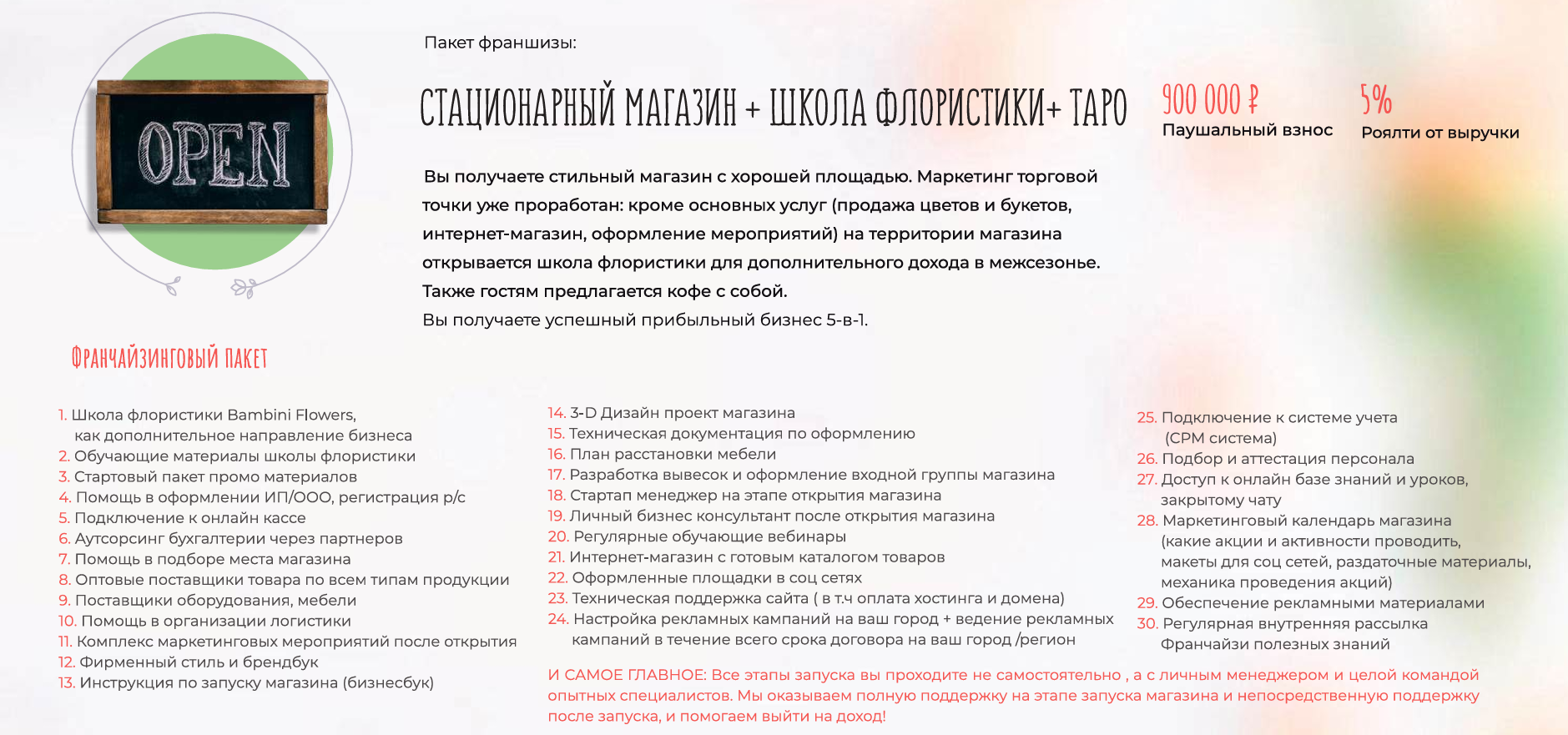 - Обучение ведению бизнеса и поддержка в течение 3-х лет.