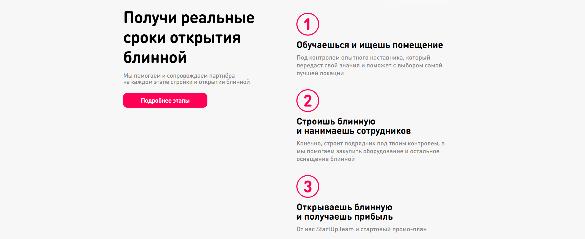 - Обучение: 3-недельное очное обучение для партнера и управляющего (включая стажировку в действующих блинных). Выдача сертификата;
