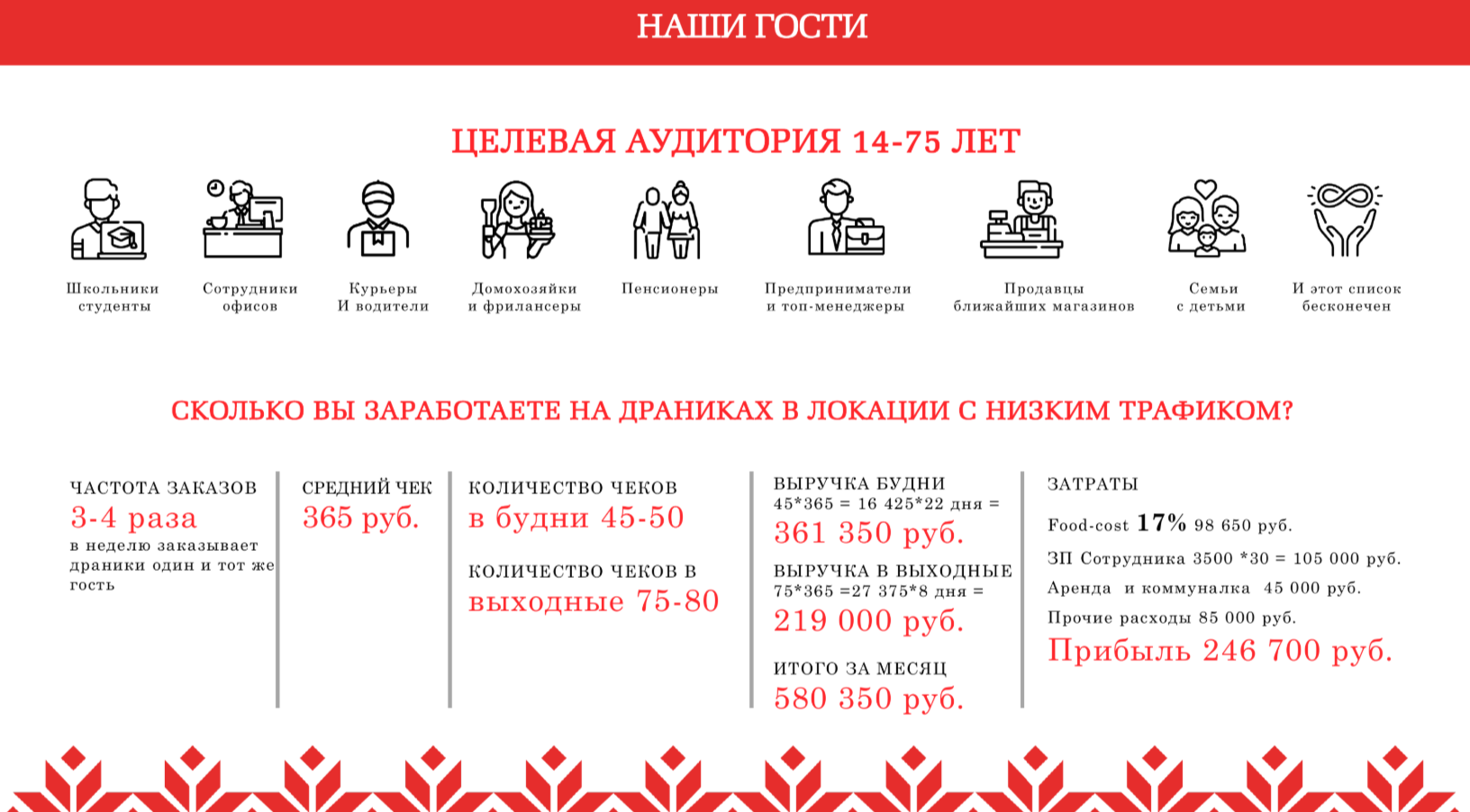 – Высокая маржинальность: Наценка на порцию драников достигает 750%, food cost всего 13-17%;
