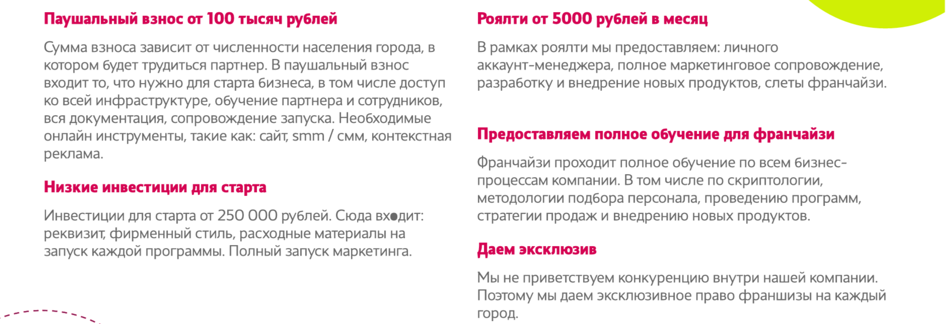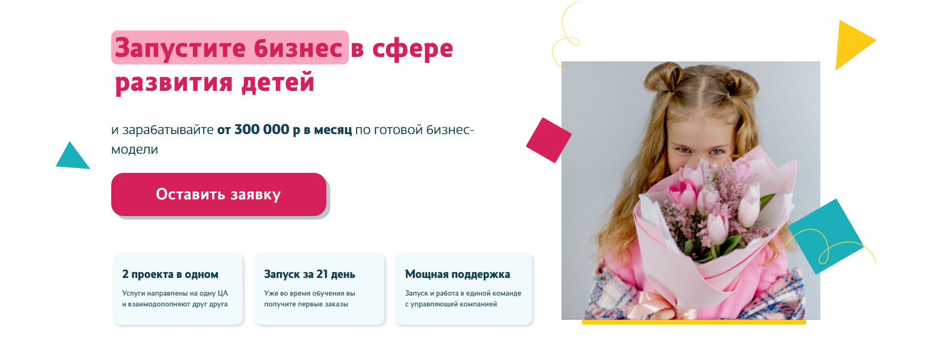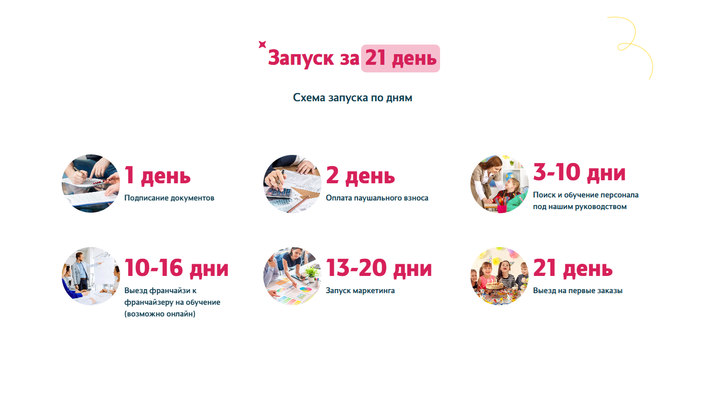 – Инвестиции на запуск: от 250 000 ₽. В сумму входят: реквизит, фирменный стиль, расходные материалы на запуск программ, полный запуск маркетинга, оборудование и обучение;