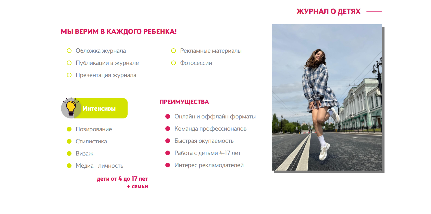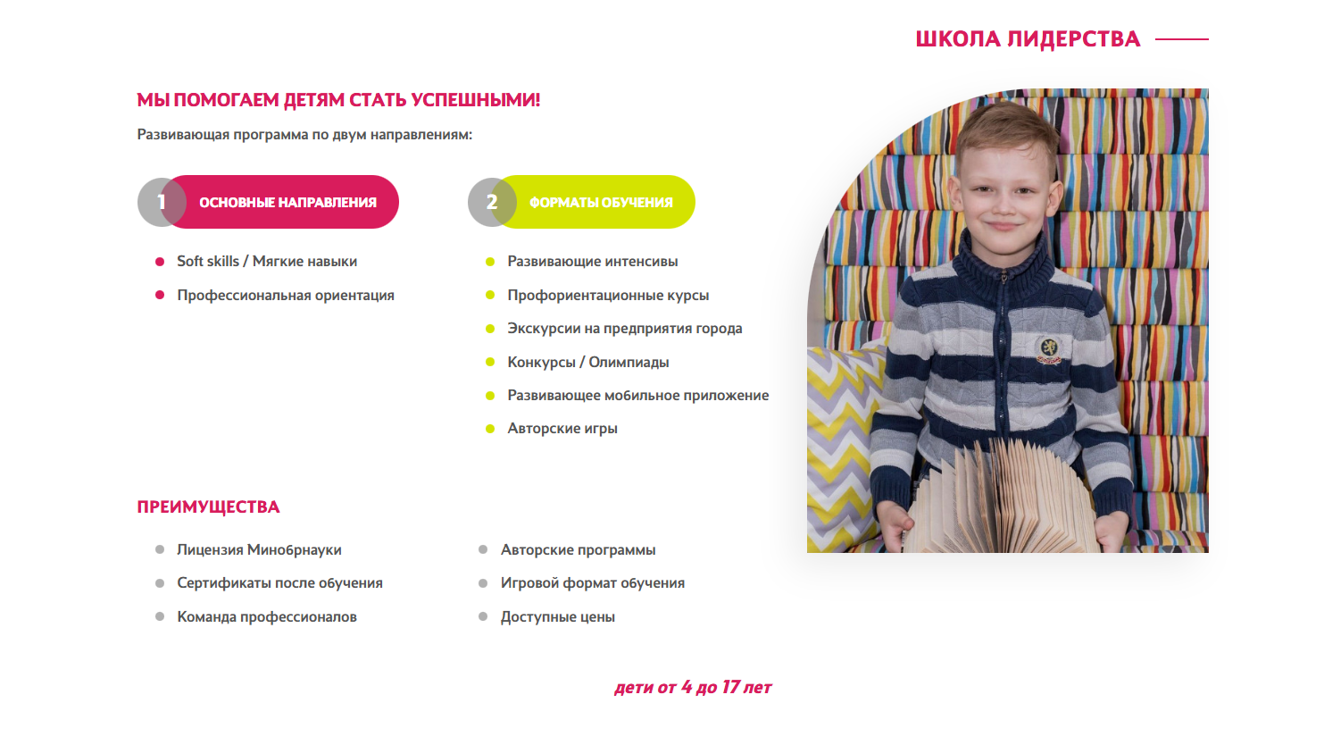 Концепция: Сеть детских проектов, объединяющих два направления: «Школа лидерства» (развитие гибких навыков и профориентация) и семейный журнал о детях. Главная цель — помочь детям стать успешнее и счастливее, создавая среду, где ребенок развивается по всем ключевым направлениям. Формула успеха: Soft skills + профориентация + школа для родителей (работа со всей семьей).