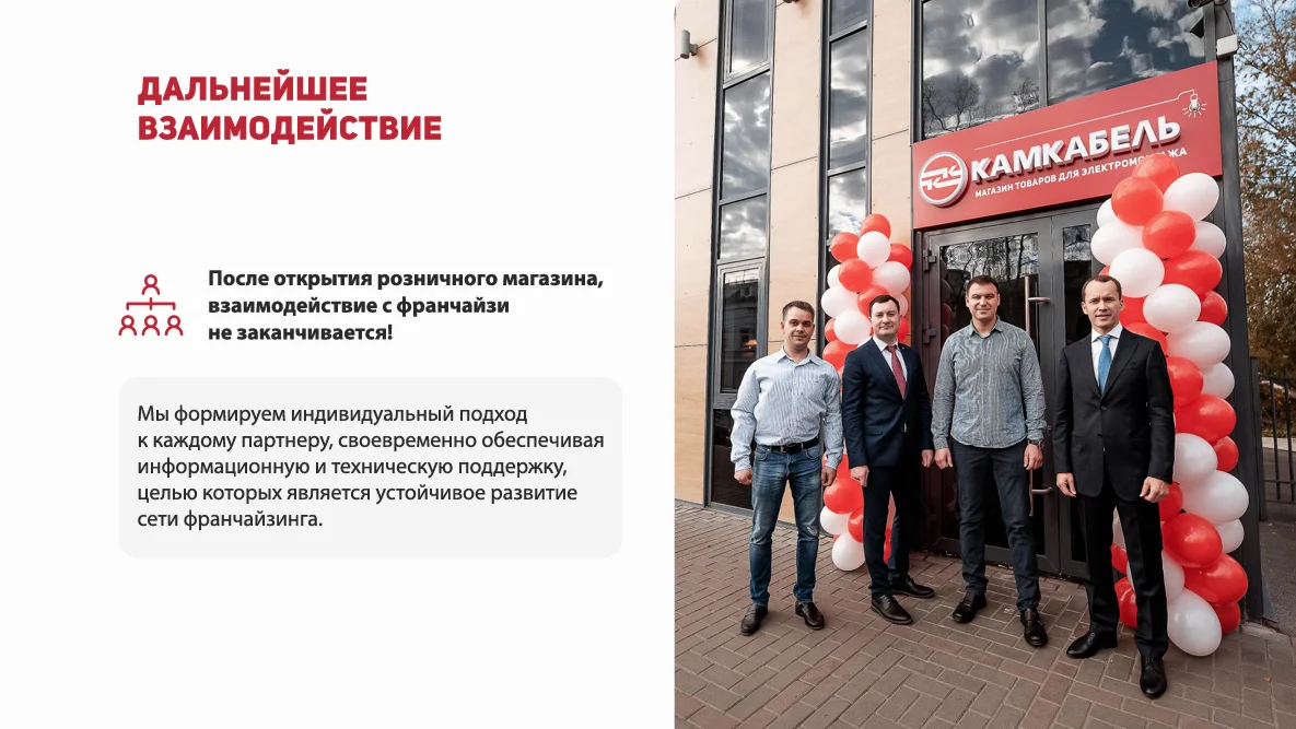 - Сопутствующие товары: Возможность расширения ассортимента электротехническими товарами от партнеров-поставщиков. Благодаря статусу официального партнера сети, франчайзи получает скидки до 50% на закупку этой группы товаров, что открывает дополнительный источник дохода и повышает маржинальность.