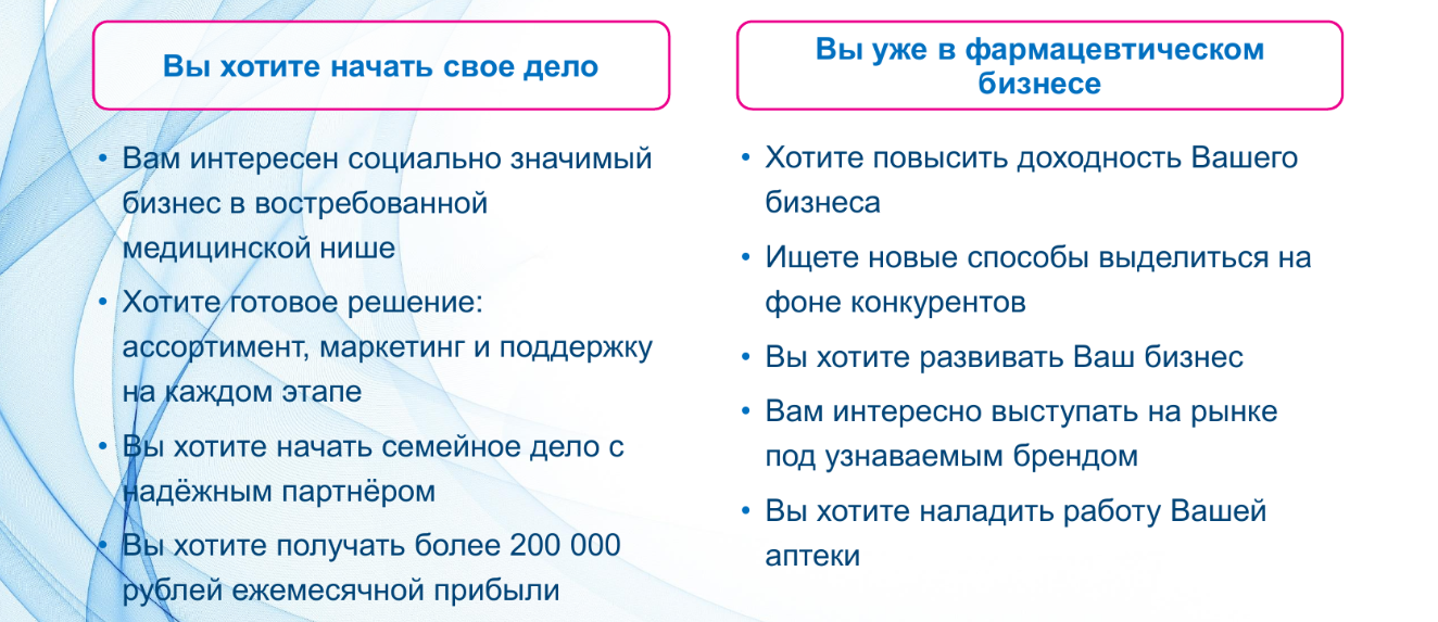 – Готовность поддерживать формат аптеки, стандарты обслуживания, рекомендованные товарные матрицы и единую ценовую политику;