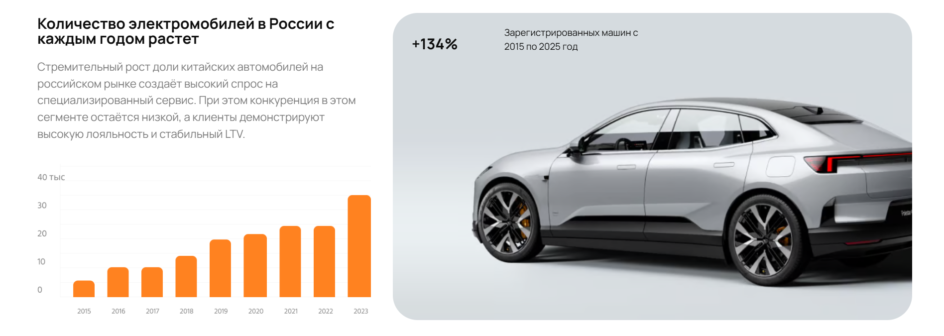 – Растущий рынок: Стремительный рост доли китайских автомобилей в России (+134% зарегистрированных машин с 2015 по 2025 год) создает высокий спрос на специализированный сервис. Конкуренция в этом сегменте остается низкой;