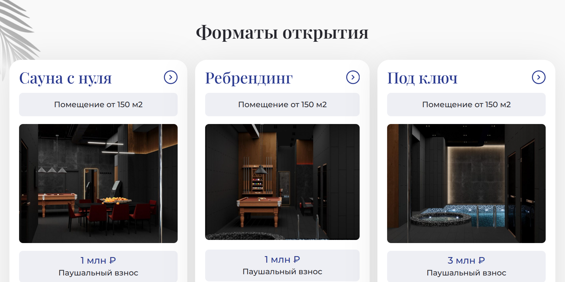 - Роялти: 20 000 ₽ в месяц за каждый зал сауны ( минимально 2 зала, т.е. от 40 000 ₽/мес. ).