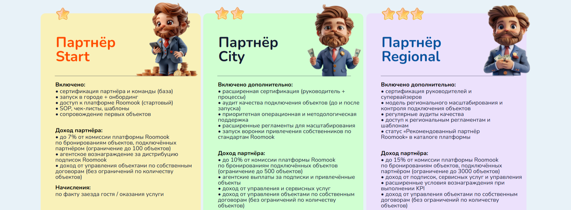 Существуют два типа участия: пакетная сертификация партнёра (более высокая планка с ежемесячной платой) и тарифы подписки Roomook (для самостоятельного управления).