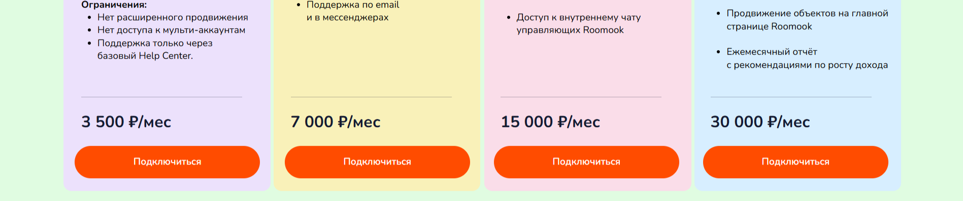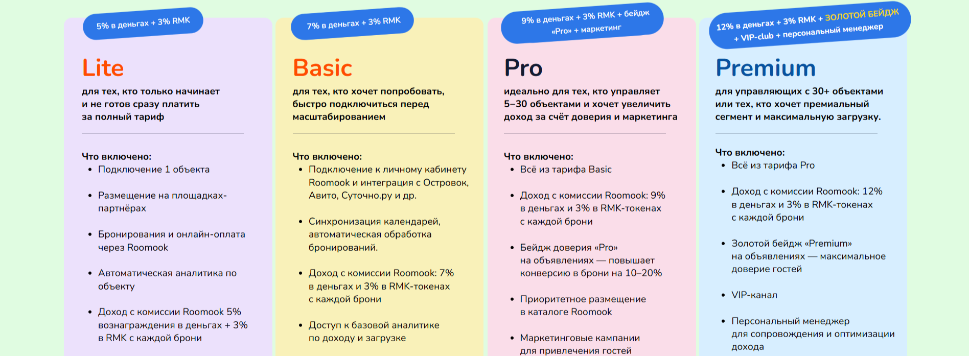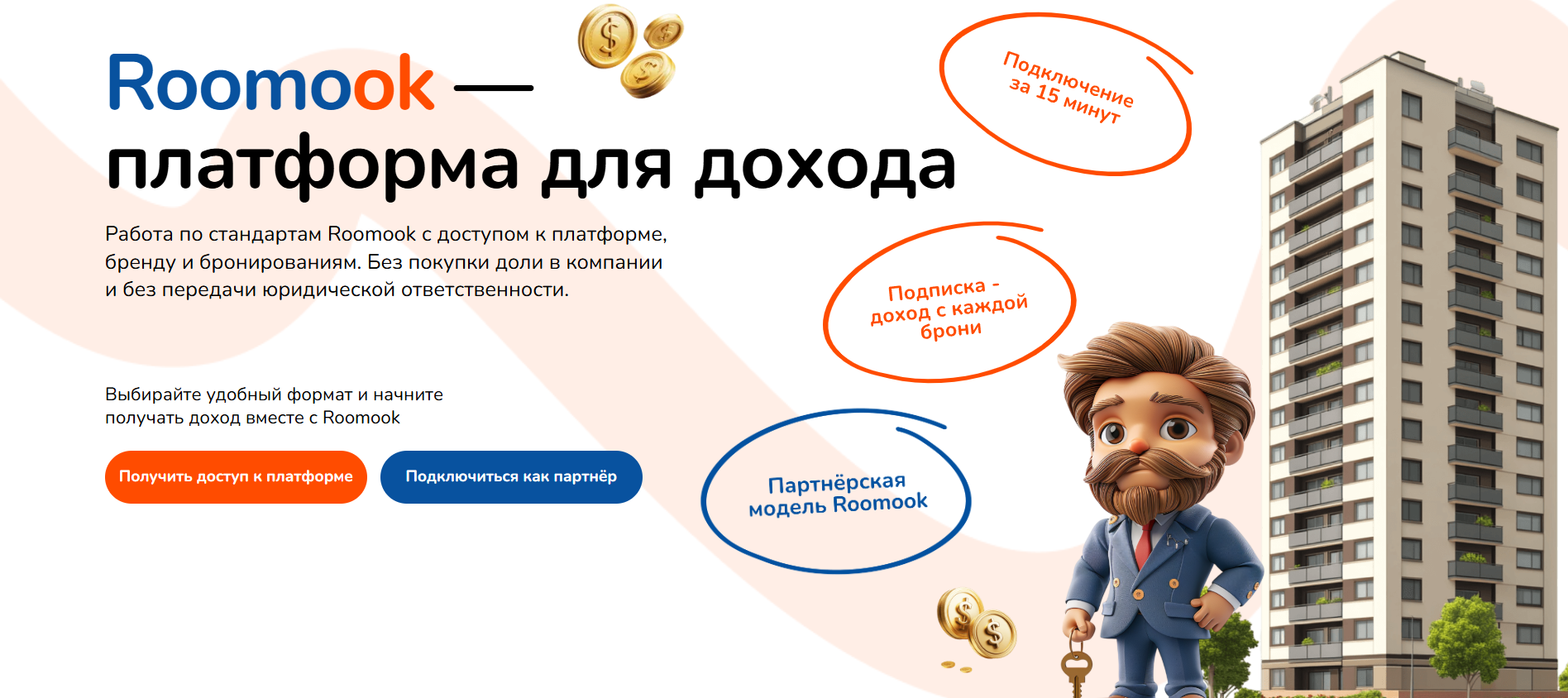 - Доход от управления объектами: Если собственник выбирает полное управление, партнёр заключает прямой договор и получает доход за управление по своим тарифам. Roomook выступает технологической платформой;