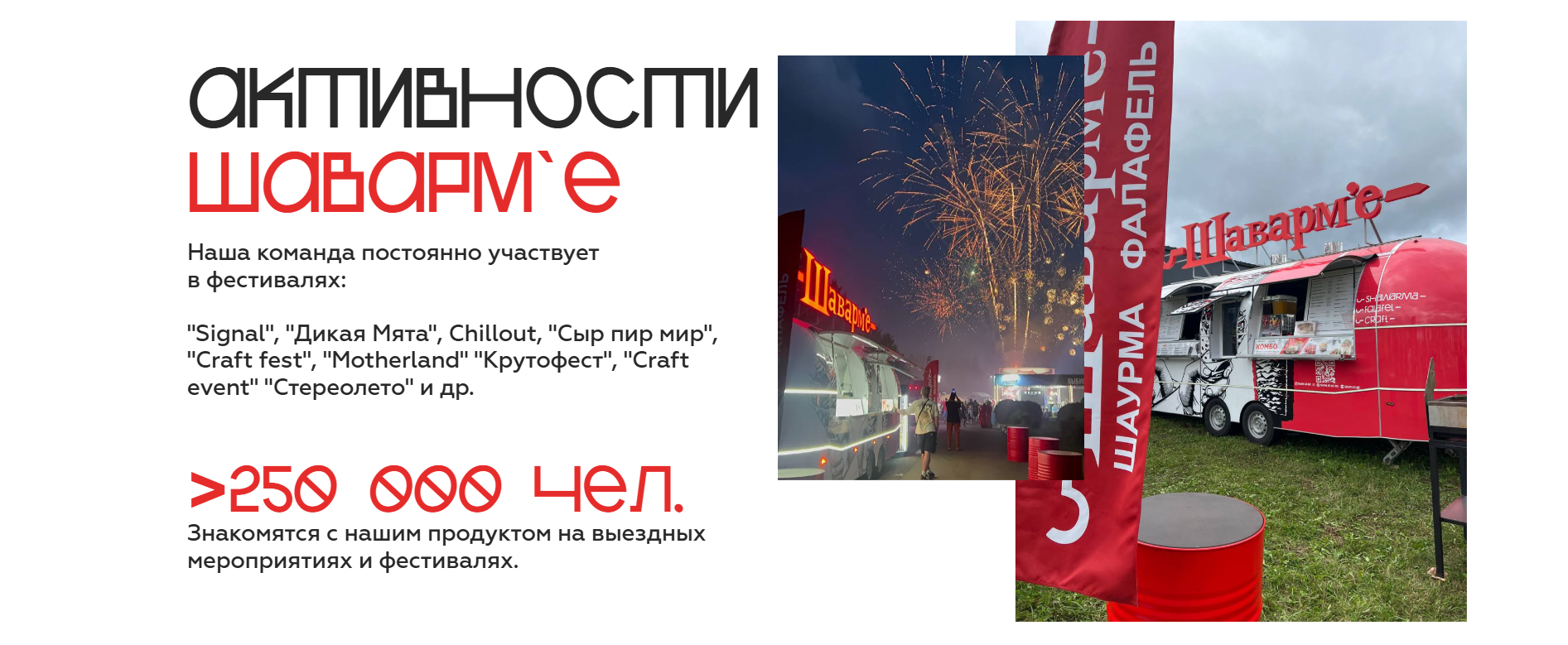- Участие в фестивалях: Широкая узнаваемость бренда за пределами стационарных точек;