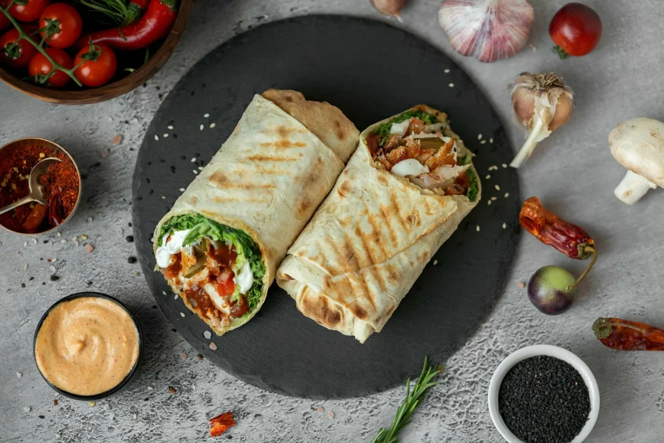 - Более 25 видов шаурмы (с курицей, говядиной, бараниной, креветками, рыбой, веганская с фалафелем).