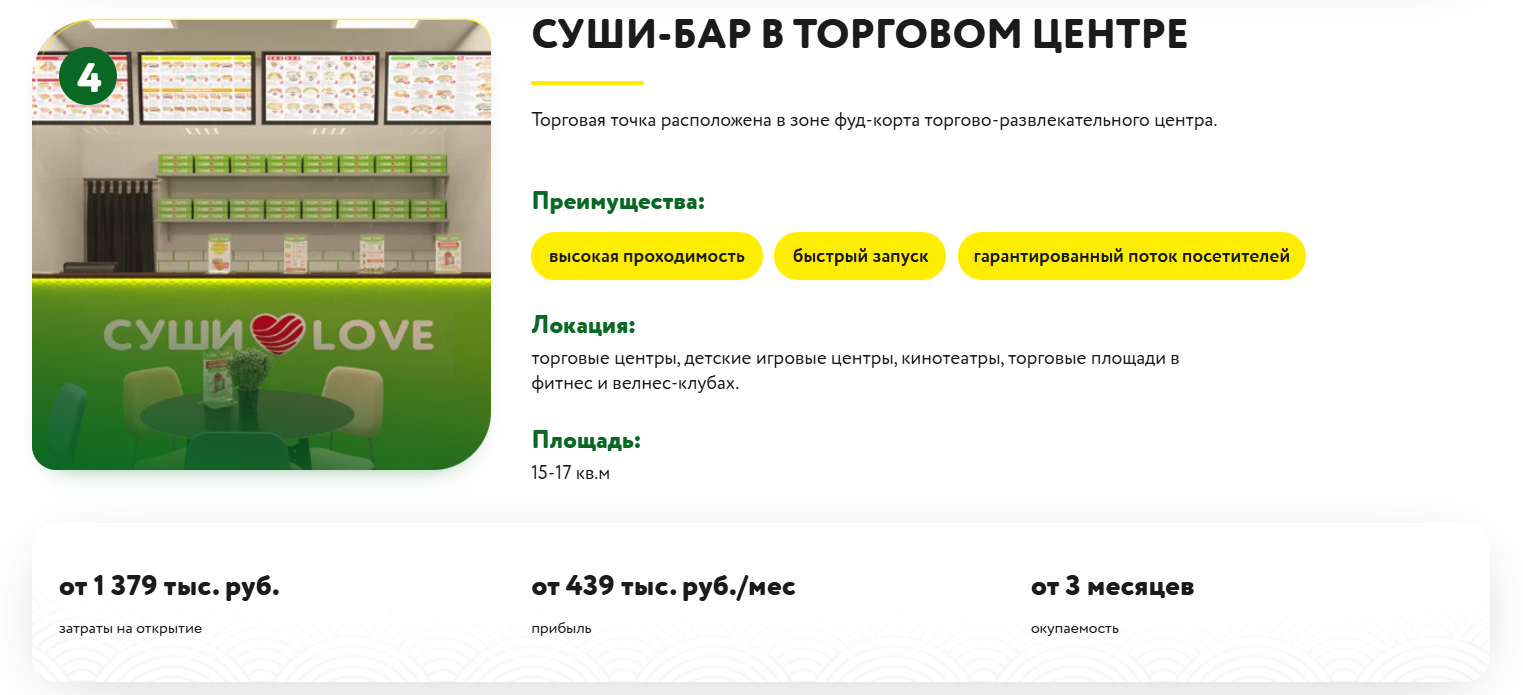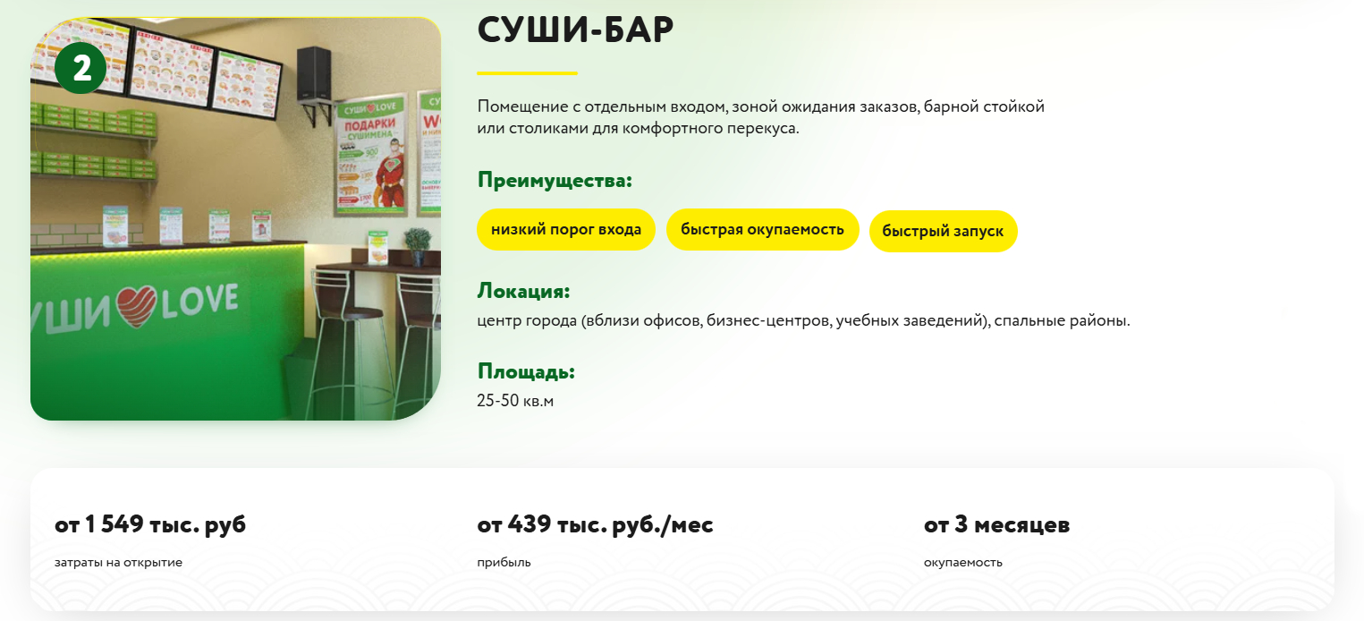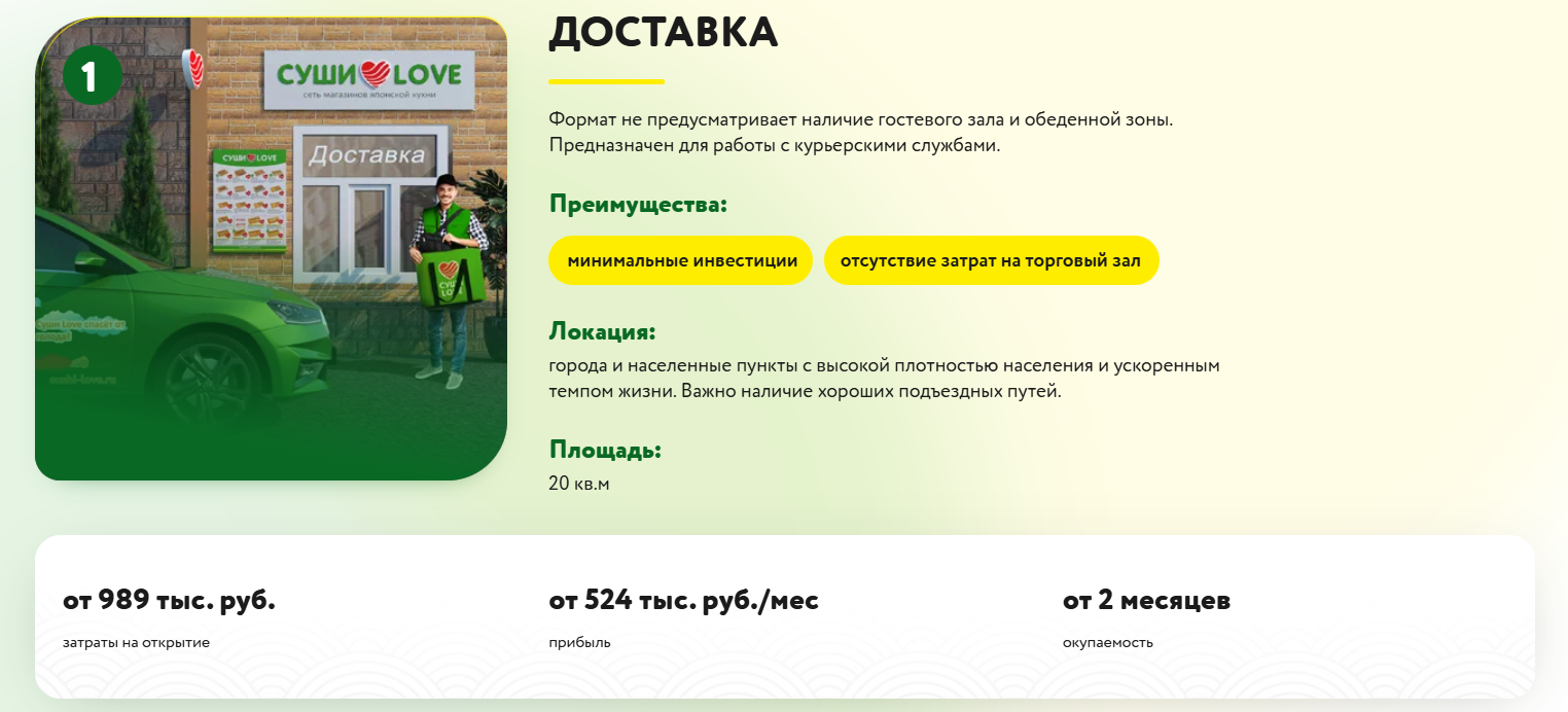 Вы открываете магазин японской кухни под брендом "Суши LOVE". Формат выбираете под себя: